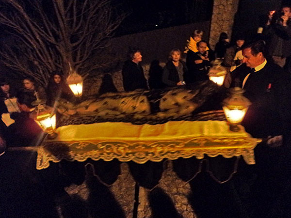 The Jesus statue is taken down from the cross and carried in silent procession down the Calvary Hill in Pollenca.