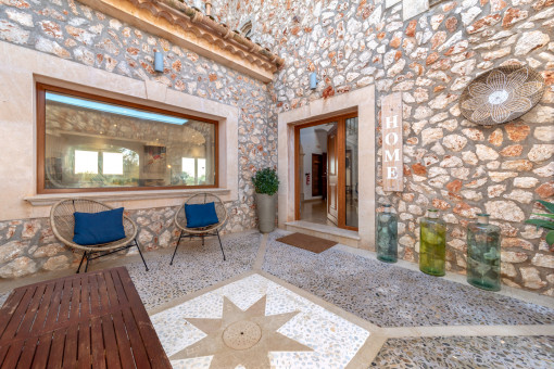 Further features include modern, high-quality Santanyi-stone arches in the living areas, underfloor oil-fired central heating, double-glazed windows and doors, and real marble floors in a natural-stone pattern.