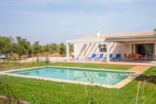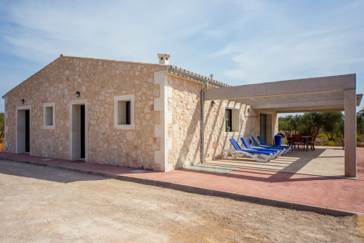 The constructed living area of approx. 140 sqm comprises the entrance area, 3 double bedrooms with fitted wardrobes, a shower bathroom, the master bedroom with bathroom en suite, a separate shower bathroom for guests and a spacious living/dining/kitchen area. The architecture is traditional Mediterranean. Particularly noteworthy are the high ceilings with wooden beams, the natural stone façade and the numerous exits - from all rooms - to the outside area. The 41 sqm pool is the focal point of the outdoor area. The covered pool terrace and the garden can be reached from the living room.