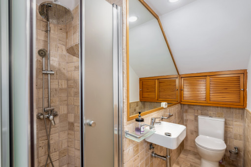 The total living area of approx. 269 sqm is distributed over several levels. On the ground floor, there is a spacious living and dining area with an open-plan kitchen, as well as a small bathroom with a shower. A glass ceiling between the kitchen and dining area brings plenty of natural light into the space. From here, you can access the peaceful terrace with wooden decking, which offers a high degree of privacy and a charming, idyllic atmosphere.