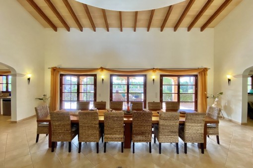 With 2 levels the finca has 6 bedrooms. On the ground floor is the generous entrance area which leads into the comfortable dining area with fireplace and high ceilings with concreted beams in wood look underlining the airy, Mediterranean atmosphere. Large floor-to-ceiling windows provide access to the covered terrace, the perfect shady place to be on the hotter summer days.